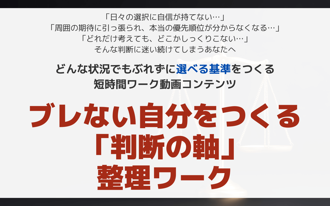 ブレない自分をつくる「判断の軸」整理ワークは、日々の迷いや判断にエネルギーを奪われているあなたが、自分の価値観を整理し、どんな状況でも落ち着いて選べる判断の軸をつくるための動画プログラムです。