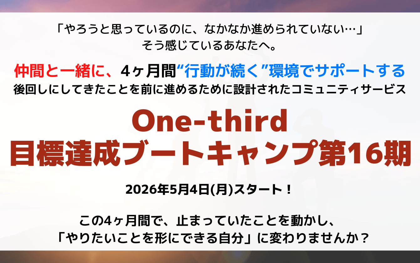 『One-third目標達成ブートキャンプ第16期』は、2026年5月4日(月)スタート。